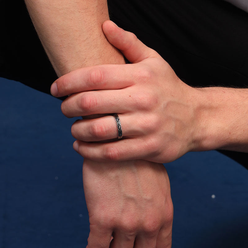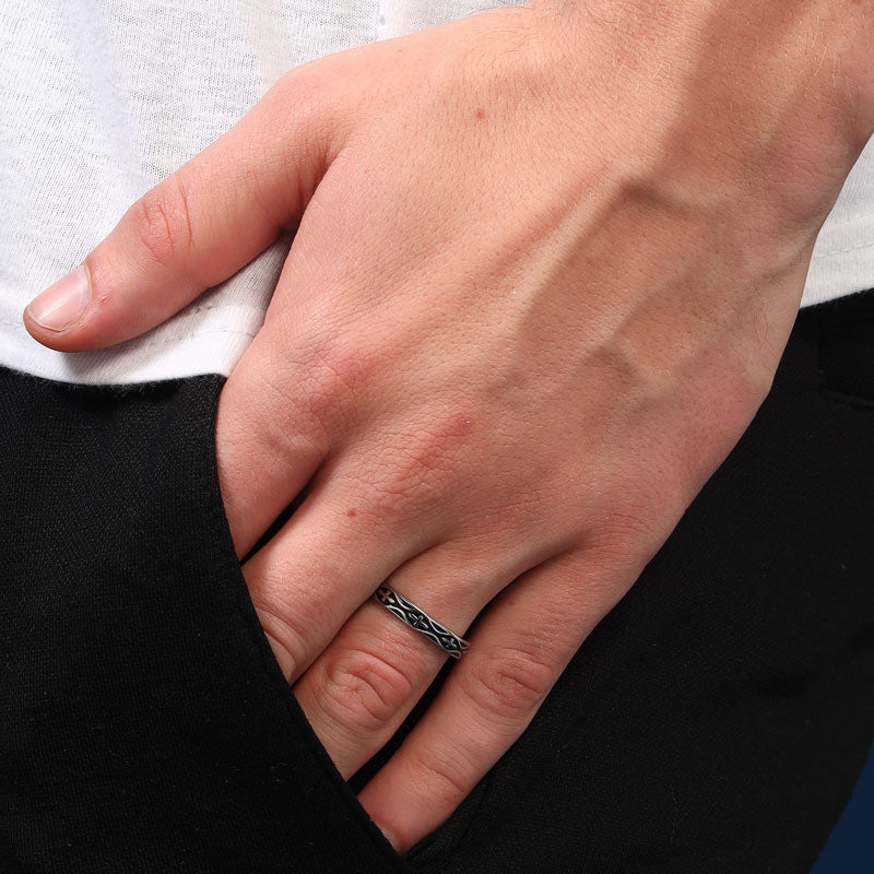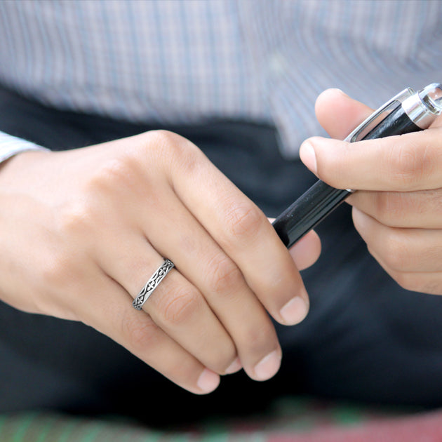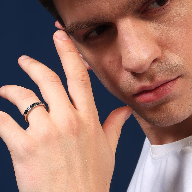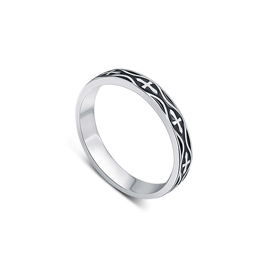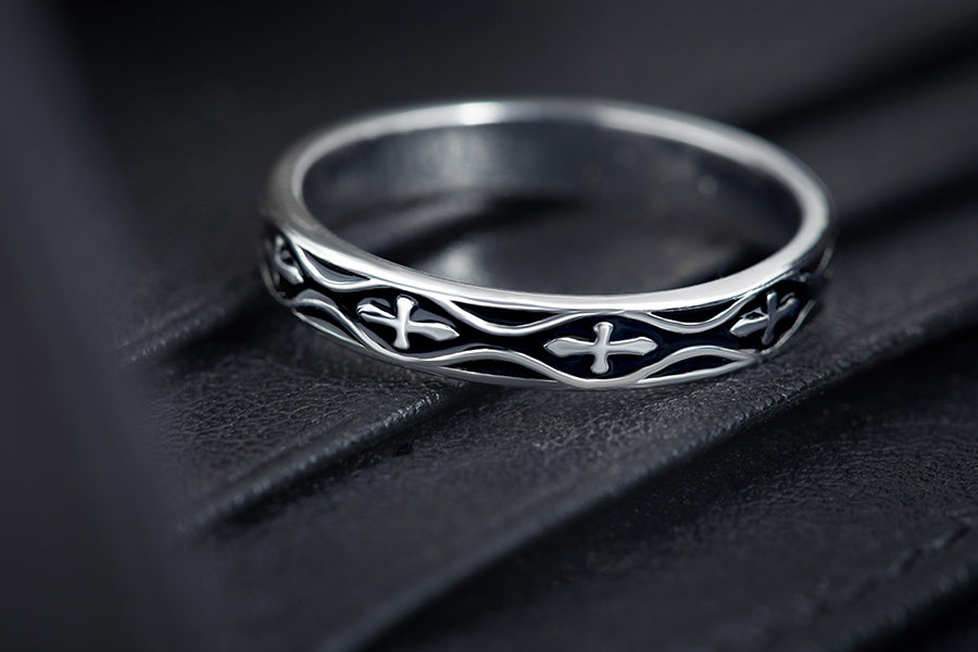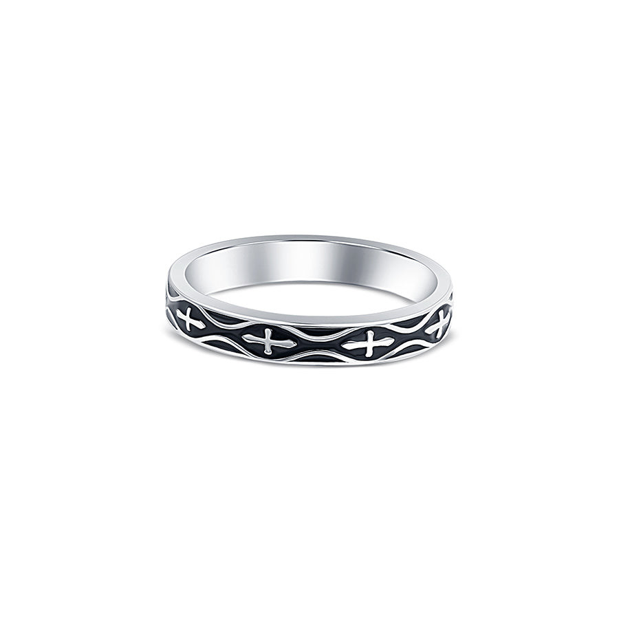 This cross patterned black enamel sterling silver band for men is a classy piece that fits the style of a modern men. A perfect Band for your daily wear is completed with a black enamel and cross pattern in rhodium finish.