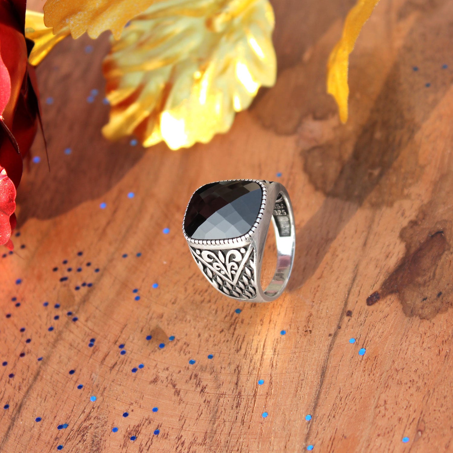 Make a statement with this majestic sterling silver ring, expertly crafted for the modern man who exudes confidence and sophistication. The pièce de résistance is the large oval-shaped black onyx, set as the centrepiece, evoking a sense of luxury and refinement. The ring boasts an oxidised finish, adding a touch of ruggedness to its overall elegance, perfect for those who appreciate a hint of edge in their accessories.