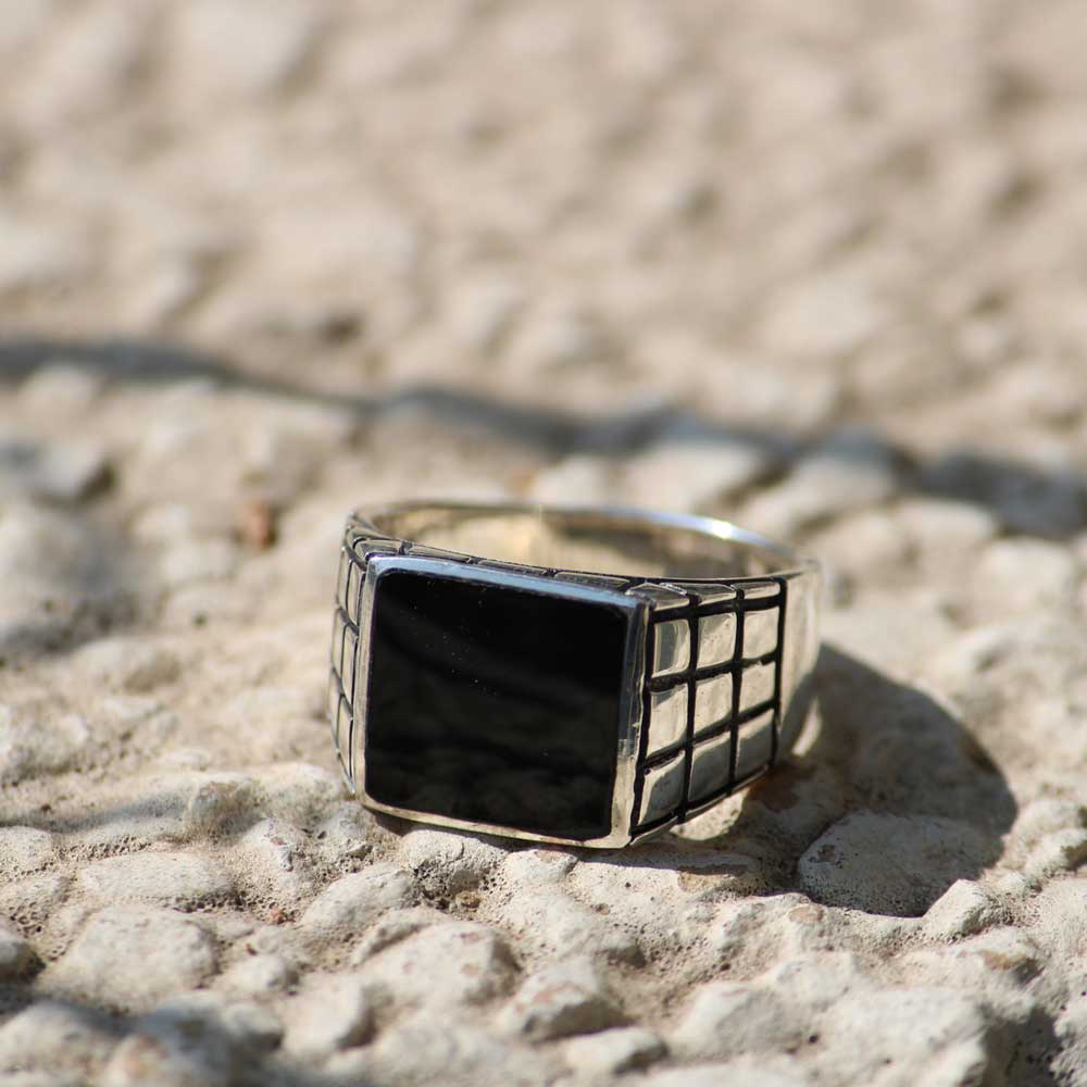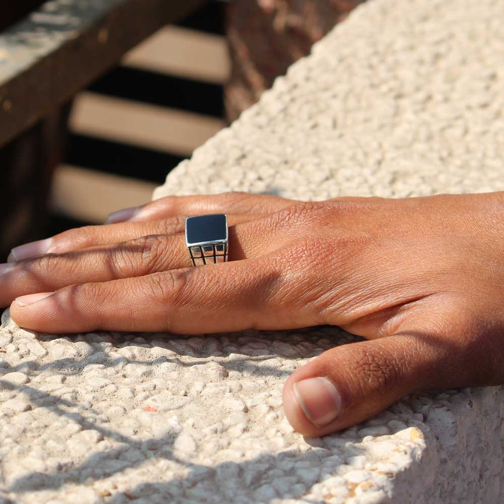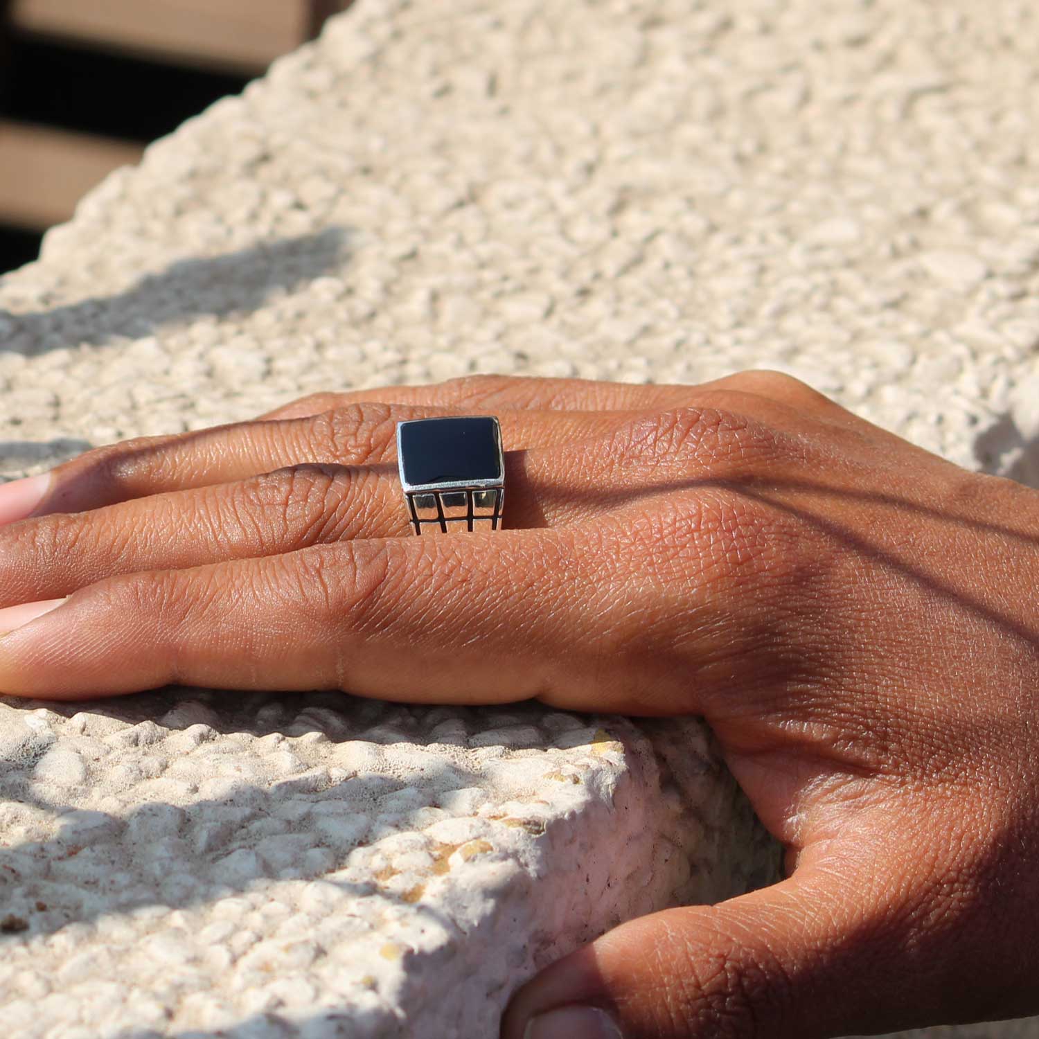 Crafted in sterling silver with an oxidised finish, this Noir Love Ring for Men features a striking black opal at its centre, set in a square setting. Checkers adorn the sides, creating a unique and elegant aesthetic, sure to elevate any look. The perfect addition to your collection. This timeless design is a must-have for any jewellery connoisseur. The durable sterling silver construction ensures this stylish piece can be with you for years to come.